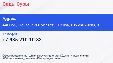 Сады Суры по адресу 440066, Пензенская область, Пенза, Рахманинова, 1 в дальнейшем Организация, размещена в следующих категориях:
