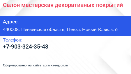 Салон-мастерская декоративных покрытий по адресу 440008, Пензенская область, Пенза, Новый Кавказ, 6 в дальнейшем Организация, размещена в следующих категориях: