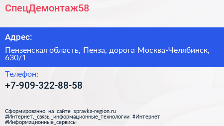 СпецДемонтаж58 по адресу Пензенская область, Пенза, дорога Москва-Челябинск, 630/1 в дальнейшем Организация, размещена в следующих категориях:
