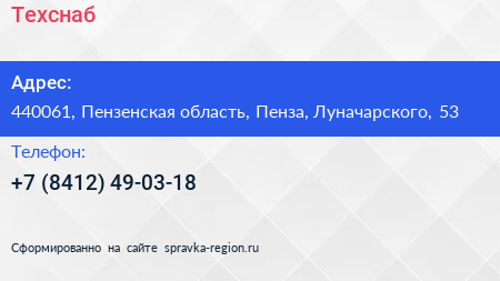 Техснаб по адресу 440061, Пензенская область, Пенза, Луначарского, 53 в дальнейшем Организация, размещена в следующих категориях: