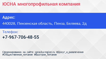 ЮСНА, многопрофильная компания по адресу 440028, Пензенская область, Пенза, Беляева, 2д в дальнейшем Организация, размещена в следующих категориях: