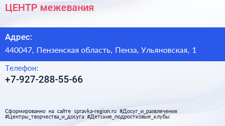 ЦЕНТР межевания по адресу 440047, Пензенская область, Пенза, Ульяновская, 1 в дальнейшем Организация, размещена в следующих категориях: