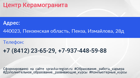Центр Керамогранита по адресу 440023, Пензенская область, Пенза, Измайлова, 28д в дальнейшем Организация, размещена в следующих категориях: