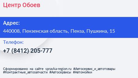 Центр Обоев по адресу 440008, Пензенская область, Пенза, Пушкина, 15 в дальнейшем Организация, размещена в следующих категориях: