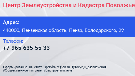 Центр Землеустройства и Кадастра Поволжье по адресу 440000, Пензенская область, Пенза, Володарского, 29 в дальнейшем Организация, размещена в следующих категориях: