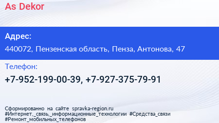 As`Dekor по адресу 440072, Пензенская область, Пенза, Антонова, 47 в дальнейшем Организация, размещена в следующих категориях: