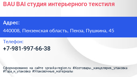BAU-BAI, студия интерьерного текстиля по адресу 440008, Пензенская область, Пенза, Пушкина, 45 в дальнейшем Организация, размещена в следующих категориях: