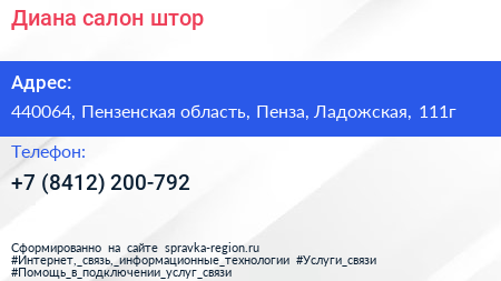 Диана, салон штор по адресу 440064, Пензенская область, Пенза, Ладожская, 111г в дальнейшем Организация, размещена в следующих категориях: