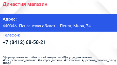 Династия, магазин по адресу 440046, Пензенская область, Пенза, Мира, 74 в дальнейшем Организация, размещена в следующих категориях: