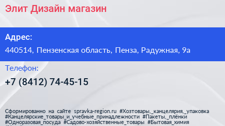 Элит Дизайн, магазин по адресу 440514, Пензенская область, Пенза, Радужная, 9а в дальнейшем Организация, размещена в следующих категориях:
