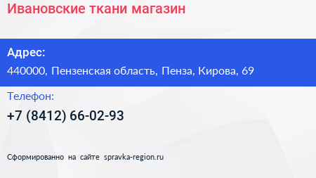 Ивановские ткани, магазин по адресу 440000, Пензенская область, Пенза, Кирова, 69 в дальнейшем Организация, размещена в следующих категориях: