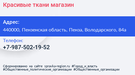 Красивые ткани, магазин по адресу 440000, Пензенская область, Пенза, Володарского, 84а в дальнейшем Организация, размещена в следующих категориях: