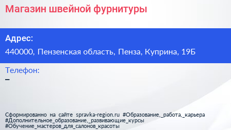 Магазин швейной фурнитуры по адресу 440000, Пензенская область, Пенза, Куприна, 19Б в дальнейшем Организация, размещена в следующих категориях: