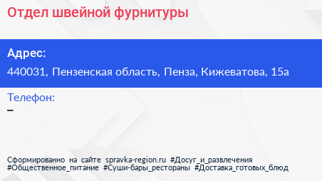 Отдел швейной фурнитуры по адресу 440031, Пензенская область, Пенза, Кижеватова, 15а в дальнейшем Организация, размещена в следующих категориях: