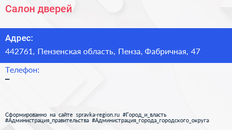 Салон дверей по адресу 442761, Пензенская область, Пенза, Фабричная, 47 в дальнейшем Организация, размещена в следующих категориях: