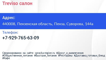 Treviso, салон по адресу 440008, Пензенская область, Пенза, Суворова, 144а в дальнейшем Организация, размещена в следующих категориях: