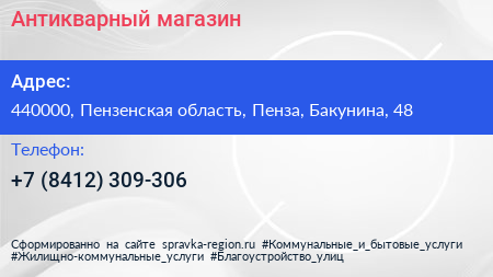 Антикварный магазин по адресу 440000, Пензенская область, Пенза, Бакунина, 48 в дальнейшем Организация, размещена в следующих категориях: