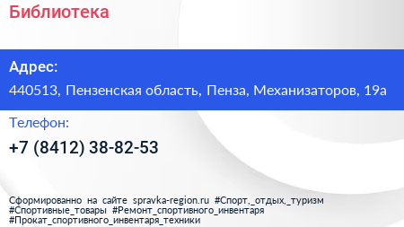 Библиотека по адресу 440513, Пензенская область, Пенза, Механизаторов, 19а в дальнейшем Организация, размещена в следующих категориях: