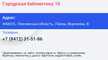 Городская библиотека №10 по адресу 440031, Пензенская область, Пенза, Воронова, 8 в дальнейшем Организация, размещена в следующих категориях: