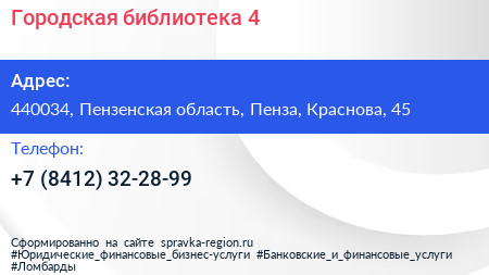 Городская библиотека №4 по адресу 440034, Пензенская область, Пенза, Краснова, 45 в дальнейшем Организация, размещена в следующих категориях:
