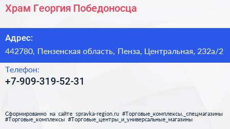 Храм Георгия Победоносца по адресу 442780, Пензенская область, Пенза, Центральная, 232а/2 в дальнейшем Организация, размещена в следующих категориях:
