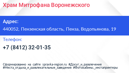 Храм Митрофана Воронежского по адресу 440052, Пензенская область, Пенза, Водопьянова, 19 в дальнейшем Организация, размещена в следующих категориях: