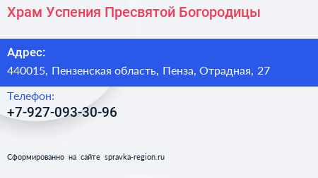 Храм Успения Пресвятой Богородицы по адресу 440015, Пензенская область, Пенза, Отрадная, 27 в дальнейшем Организация, размещена в следующих категориях:
