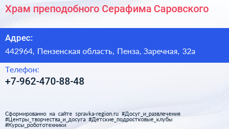 Храм преподобного Серафима Саровского по адресу 442964, Пензенская область, Пенза, Заречная, 32а в дальнейшем Организация, размещена в следующих категориях: