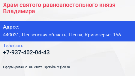 Храм святого равноапостольного князя Владимира по адресу 440031, Пензенская область, Пенза, Кривозерье, 156 в дальнейшем Организация, размещена в следующих категориях: