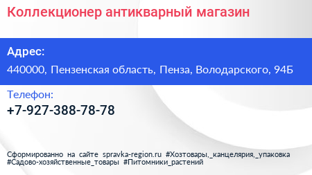 Коллекционер, антикварный магазин по адресу 440000, Пензенская область, Пенза, Володарского, 94Б в дальнейшем Организация, размещена в следующих категориях:
