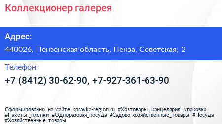 Коллекционер, галерея по адресу 440026, Пензенская область, Пенза, Советская, 2 в дальнейшем Организация, размещена в следующих категориях: