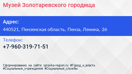 Музей Золотаревского городища по адресу 440521, Пензенская область, Пенза, Ленина, 26 в дальнейшем Организация, размещена в следующих категориях: