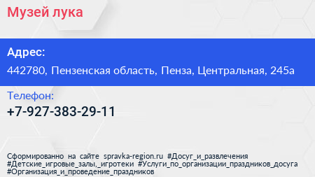 Музей лука по адресу 442780, Пензенская область, Пенза, Центральная, 245а в дальнейшем Организация, размещена в следующих категориях: