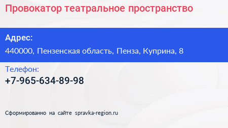 Провокатор, театральное пространство по адресу 440000, Пензенская область, Пенза, Куприна, 8 в дальнейшем Организация, размещена в следующих категориях: