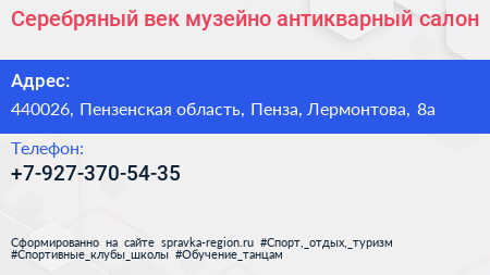 Серебряный век, музейно-антикварный салон по адресу 440026, Пензенская область, Пенза, Лермонтова, 8а в дальнейшем Организация, размещена в следующих категориях: