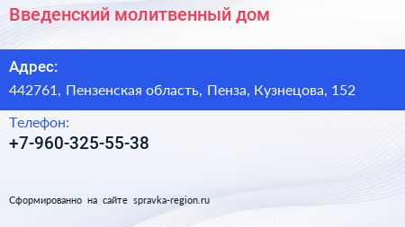 Введенский молитвенный дом по адресу 442761, Пензенская область, Пенза, Кузнецова, 152 в дальнейшем Организация, размещена в следующих категориях:
