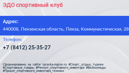 ЭДО, спортивный клуб по адресу 440008, Пензенская область, Пенза, Коммунистическая, 28 в дальнейшем Организация, размещена в следующих категориях: