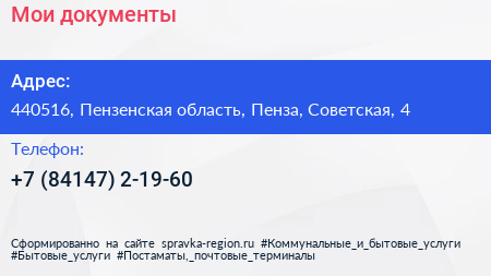 Мои документы по адресу 440516, Пензенская область, Пенза, Советская, 4 в дальнейшем Организация, размещена в следующих категориях: