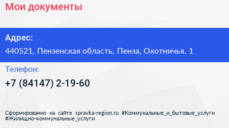 Мои документы по адресу 440521, Пензенская область, Пенза, Охотничья, 1 в дальнейшем Организация, размещена в следующих категориях: