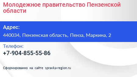 Молодежное правительство Пензенской области по адресу 440034, Пензенская область, Пенза, Маркина, 2 в дальнейшем Организация, размещена в следующих категориях: