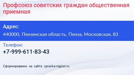Профсоюз советских граждан, общественная приемная по адресу 440000, Пензенская область, Пенза, Московская, 83 в дальнейшем Организация, размещена в следующих категориях: