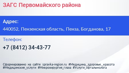 ЗАГС Первомайского района по адресу 440052, Пензенская область, Пенза, Богданова, 17 в дальнейшем Организация, размещена в следующих категориях: