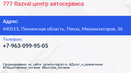 777 Razval, центр автосервиса по адресу 440513, Пензенская область, Пенза, Механизаторов, 36 в дальнейшем Организация, размещена в следующих категориях:
