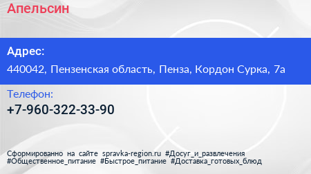 Апельсин по адресу 440042, Пензенская область, Пенза, Кордон Сурка, 7а в дальнейшем Организация, размещена в следующих категориях: