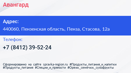 Авангард+ по адресу 440060, Пензенская область, Пенза, Стасова, 12а в дальнейшем Организация, размещена в следующих категориях: