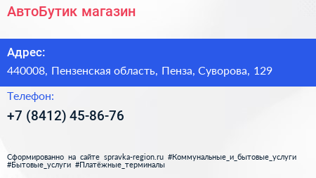 АвтоБутик, магазин по адресу 440008, Пензенская область, Пенза, Суворова, 129 в дальнейшем Организация, размещена в следующих категориях: