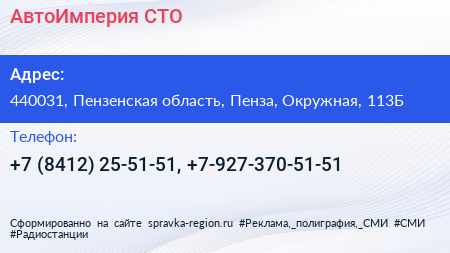 АвтоИмперия, СТО по адресу 440031, Пензенская область, Пенза, Окружная, 113Б в дальнейшем Организация, размещена в следующих категориях: