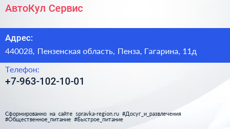 АвтоКул Сервис по адресу 440028, Пензенская область, Пенза, Гагарина, 11д в дальнейшем Организация, размещена в следующих категориях: