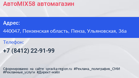 АвтоMIX58, автомагазин по адресу 440047, Пензенская область, Пенза, Ульяновская, 36а в дальнейшем Организация, размещена в следующих категориях: