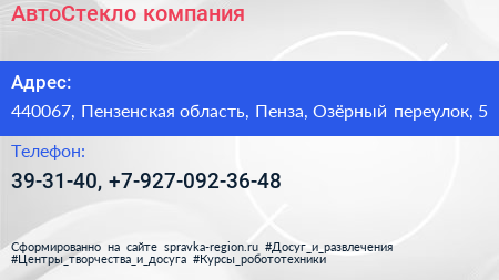 АвтоСтекло, компания по адресу 440067, Пензенская область, Пенза, Озёрный переулок, 5 в дальнейшем Организация, размещена в следующих категориях:
